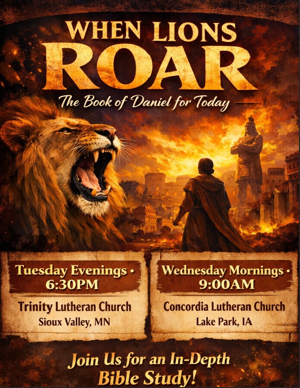 Join us for a new Bible Study Tuesday nights at 6:30pm at Trinity Sioux Valley and 9am at Concordia Lake Park as we take an in-depth look at the Book of Daniel and why this book of the Bible is incredibly important for Christian life today. High School students are especially encouraged to attend on Tuesday evening, if they can make it. We’ll take a deep look at the challenges faith faces in our world and how Daniel’s life can help us make sense of them.